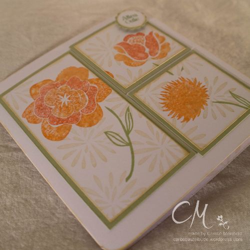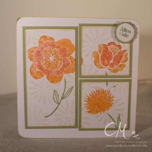 Verwendet habe ich das Stempelset Simple Stems aus dem aktuellen Frühjahrs-/ Sommerkatalog. Ich muss ja sagen, dieses Set war eher Liebe auf den zweiten Blick. Aber wie es immer so ist, man sieht die tollen Projekte, die mit diesen Stempeln entstehen, verliebt sich mehr und mehr und so ist es schließlich auch in meinem Warenkorb gewandert. Diese Karte ist mein erstes Projekt mit dem Set – eine Geburtstagskarte in Orange- und Grüntönen.