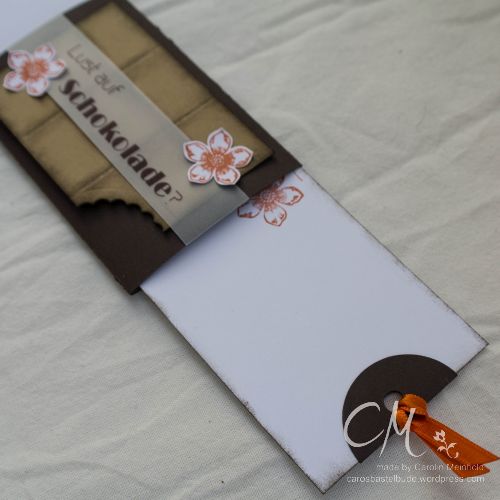 Die Idee zu dem Stück Schokolade habe ich bei Kerstin entdeckt. Sie hatte auch mal eine Tafel Schokolade auf einer ihrer Karten. Super!