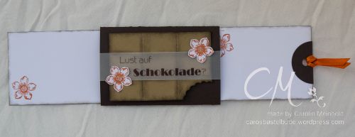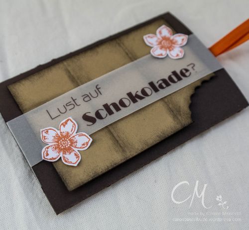 Der Schriftzug “Lust auf Schokolade? ” ist in dunkelbraun auf etwas festeres Pergamentpapier gedruckt. Hab ich auch zum ersten Mal ausprobiert. Mir gefällt es sehr gut, was meint Ihr?