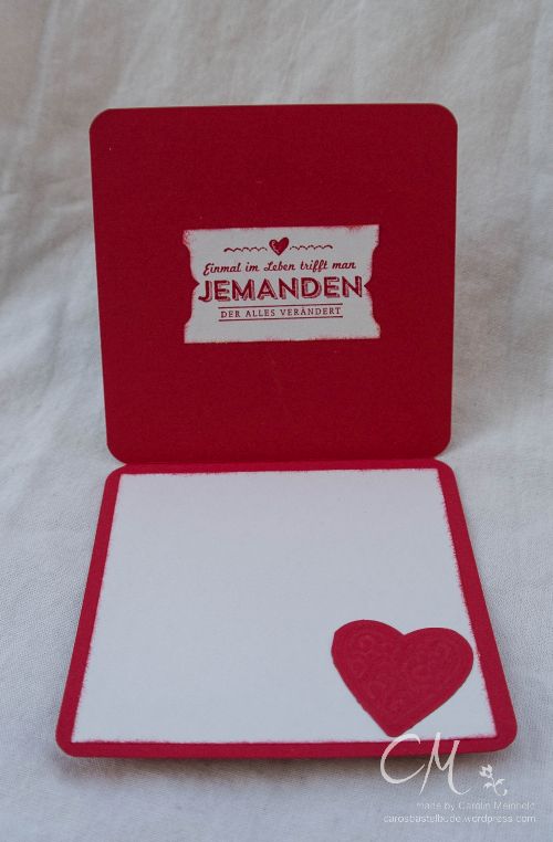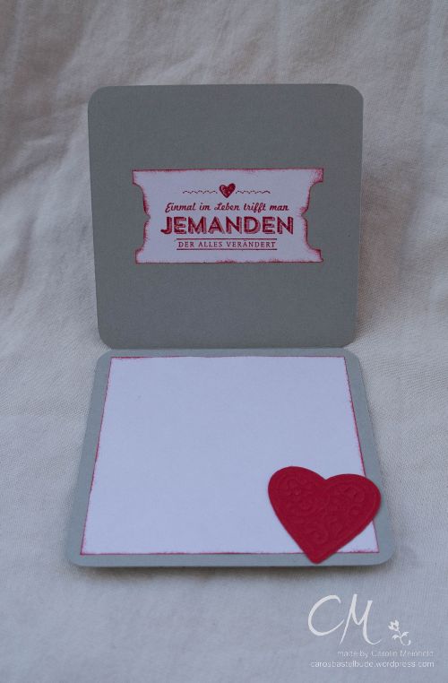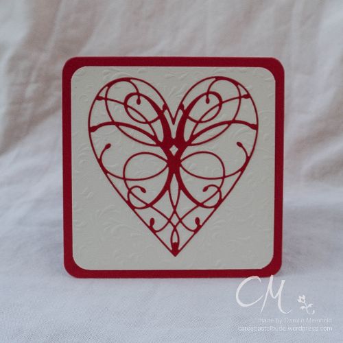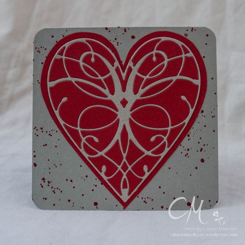 Die graue Karte ist eher durch einen Zufall entstanden. Da das Herzmotiv sehr feingliedrig ist, wurde es beim Stanzen nicht an allen Stellen richtig geschnitten. Deshalb habe ich beim Kurbeln durch die Big Shot noch eine dünne Pappe als zusätzliche Schicht eingelegt. Beim Stanzen wurde die Pappe auch leicht mit eingeschnitten und die roten “Papierzwischenstücken” sind beim Abmachen des Herzens an der Pappe hängen geblieben. Und ich dachte mir… Hey, dass schaut auch toll aus! Also habe ich die roten Papierstücken wie bei einem Mosaik auf die Pappe geklebt. Et voilá! Fertig war die zweite Karte!