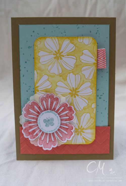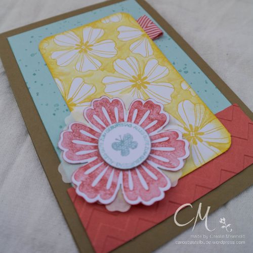 Auf der Pinterest-Seite von Stampin’ Up! gibt es eine tolle Pinnwand mit Inspirationen zu verschiedenen Farbkombinationen. Dort habe ich mich umgesehen. Heraus kam eine Kombination aus Aquamarin, Calypso, Kandiszucker und Osterglocke. Eine schön sommerliche Farbkombination, finde ich.