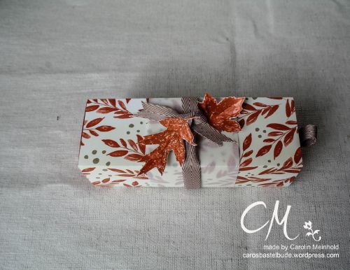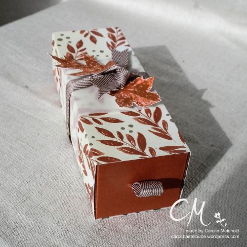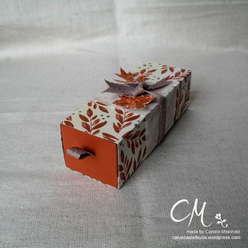 Als nächstes wird der Tonkarton in 11 x 19 cm an den roten Linien eingeschnitten. Ein Stück Band von ca. 5 cm wird durch den Schlitz geschoben und innen angeklebt. Anschließend werden die Seiten angeklebt und es entsteht die Schachtel.