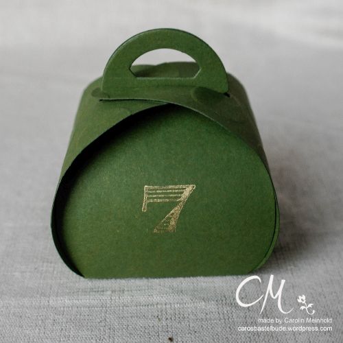 Meine Schachteln habe ich an zwei gegenüberliegenden Seiten mit Designerpapier aus dem Block Festlich geschmückt beklebt bzw. habe ich einige der Schachteln auch geprägt. Wenn ihr Teile der Box prägen wollt, macht das am besten bevor ihr die zwei Einzelteile zusammenklebt und bevor ihr die Box bestempelt. Denn sonst wird eine der geprägen Seiten platt gedrückt und die Prägung ist nicht mehr ganz so deutlich zu sehen.