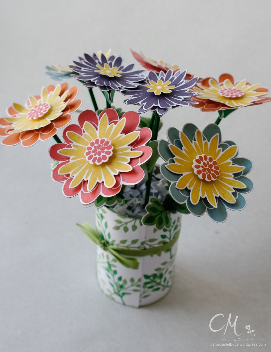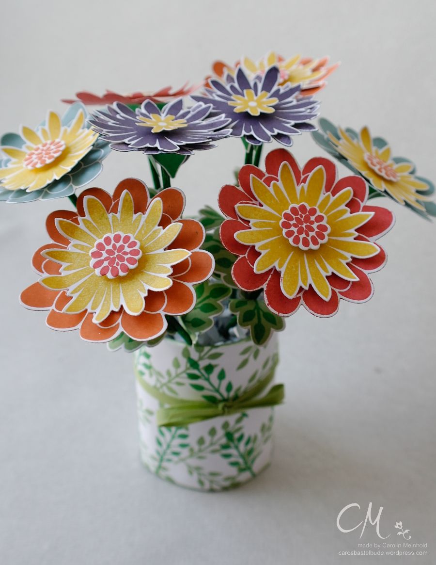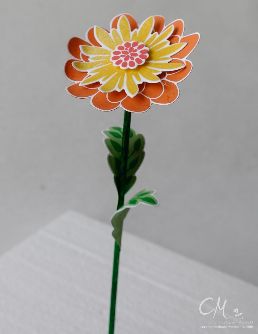 Vor einigen Tagen musste ich mal wieder Zeit überbrücken, bis mein nächster Zug nach Hause abfuhr. So habe ich in einem Zeitschriftenladen noch etwas durch die Bastelzeitschriften gestöbert. Dabei bin ich auf die tolle Idee für eine 3D Projekt mit dem Stempelset Flower Patch gestoßen – nämlich diese Blumen.