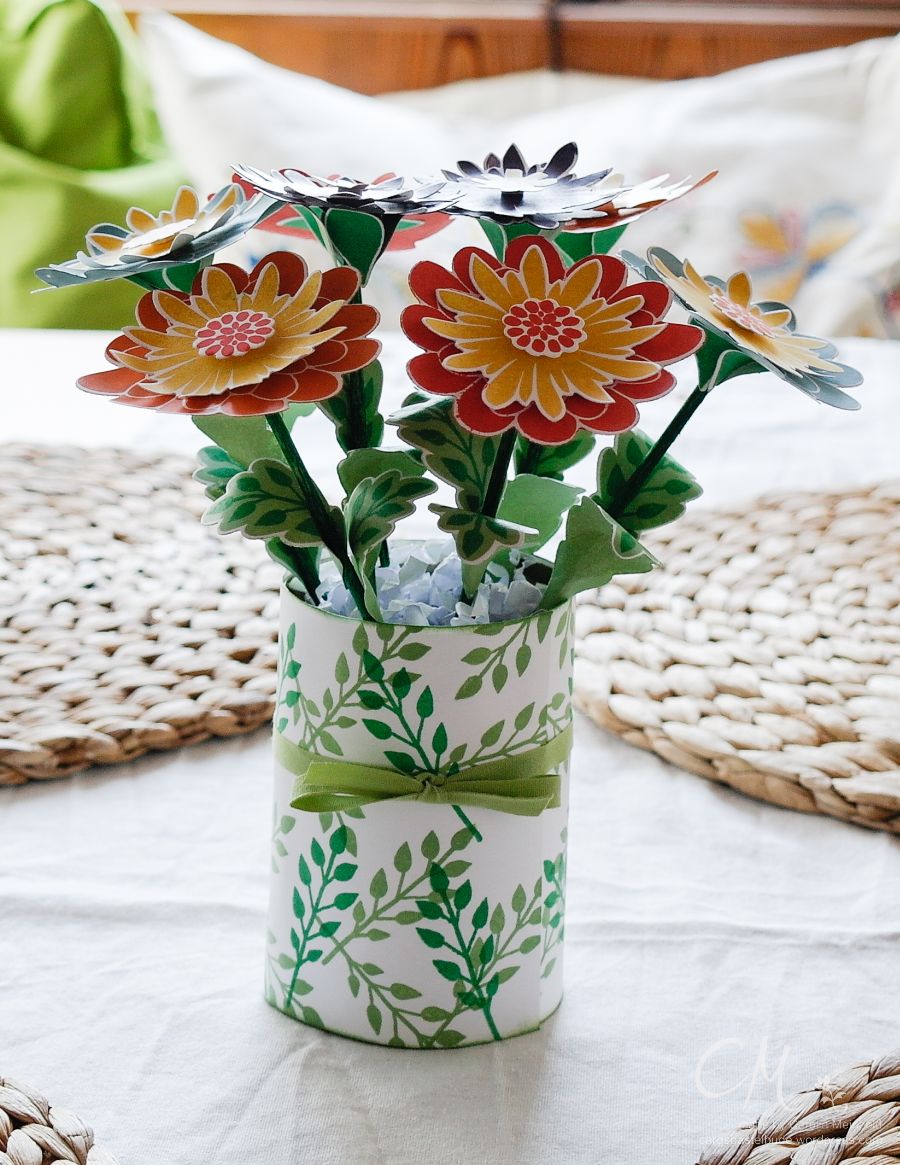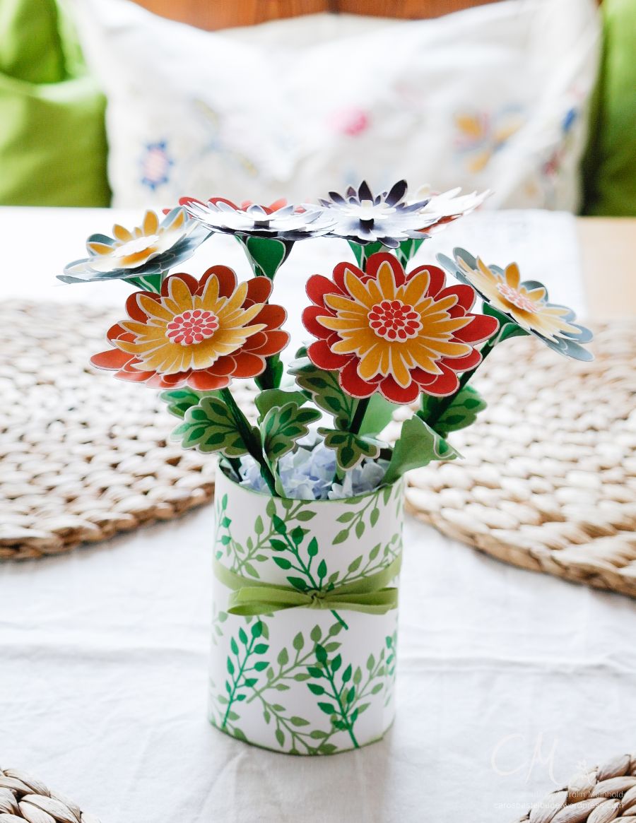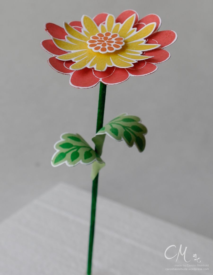 Vor einigen Tagen musste ich mal wieder Zeit überbrücken, bis mein nächster Zug nach Hause abfuhr. So habe ich in einem Zeitschriftenladen noch etwas durch die Bastelzeitschriften gestöbert. Dabei bin ich auf die tolle Idee für eine 3D Projekt mit dem Stempelset Flower Patch gestoßen – nämlich diese Blumen.
