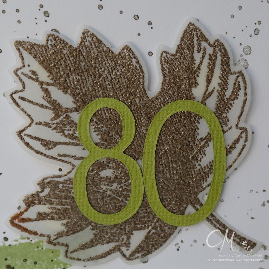 Auf dem Blatt habe ich eine 80 platziert, einmal in Grün und einmal in Espresso. Des Weiteren kam auch wieder das Set Gorgeous Grunge zum Einsatz, um einige Kleckse im Hintergrund der Karte zu platzieren. Der Gruß zum Geburtstag stammt aus dem Set Malerische Grüße.
