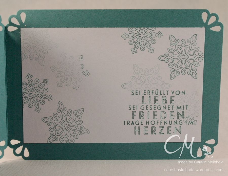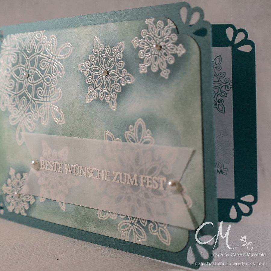Außerdem kamen zwei Produkte aus dem aktuellen Herbst/Winterkatalog zum Einsatz – das Stempelset Flockenzauber und die Trio-Stanze Elegante Ecken.