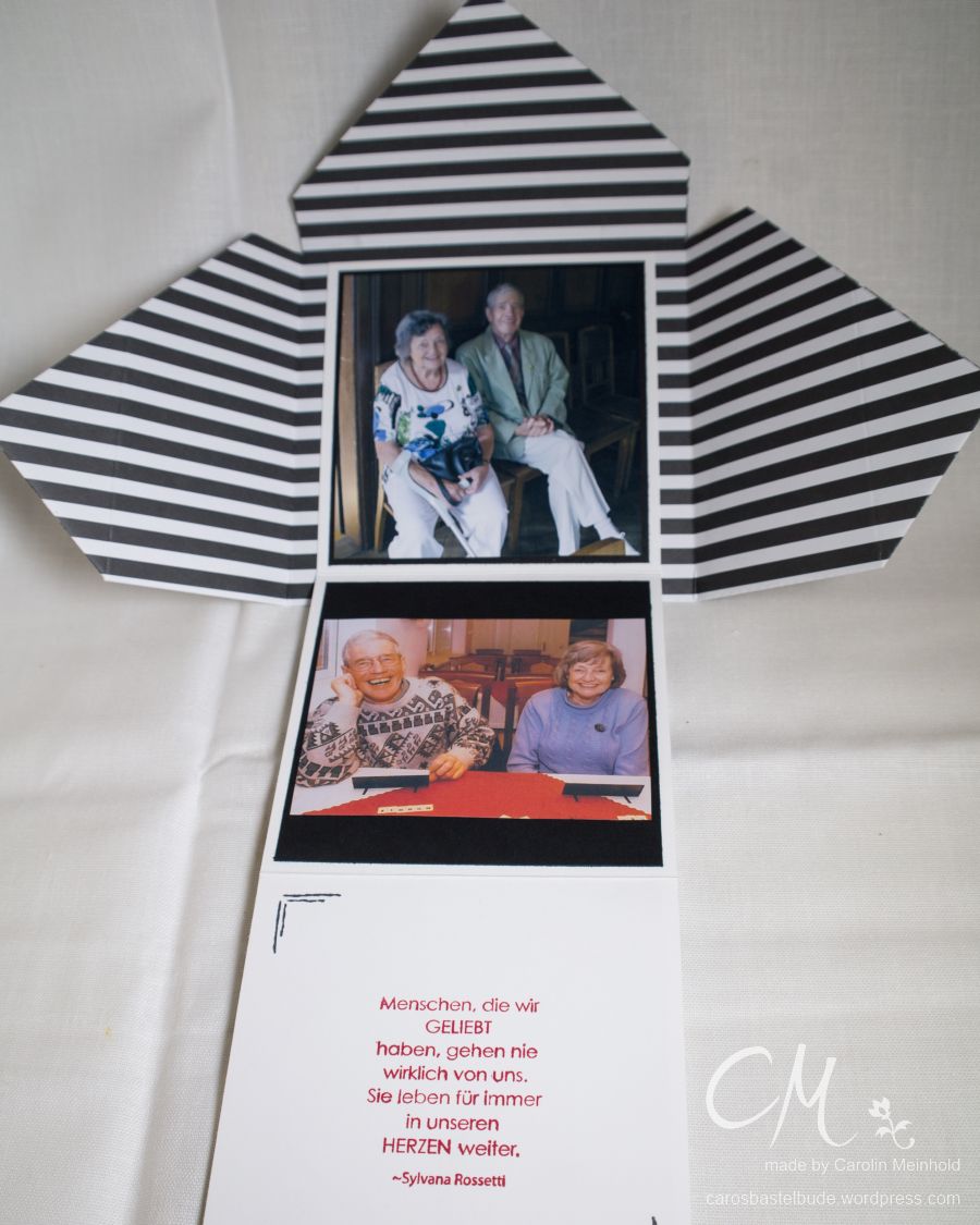Ins Innere des Minialbums wird ein kleines Leprello eingeklebt, auf welchem Platz für die Bilder ist. Die Bilder habe ich jeweils mit einem Stück schwarzen Farbkarton hinterlegt.