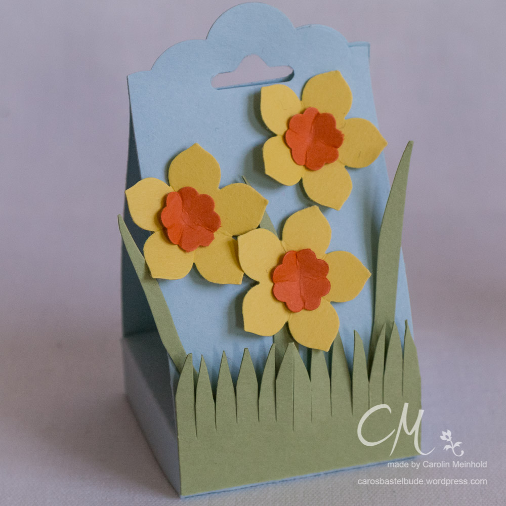 Aus Farbkarton in Osterglocke stanzt Ihr drei Blüten aus. Ich habe die Stanze Kleine Blüte verwendet. Die drei orangefarbenen Blütenstempel habe ich mit dem kleinen Wellenkreis aus dem Itty Bitty Set Formen ausgestanzt. Um einen leichten 3D Effekt hinzubekommen, legt Ihr die Blüten und die Blütenstempel jeweils in Eure Handfläche und drück mit etwas Rundem, z.B. dem Griff des Papier-Loch-Werkzeuges, darauf. Die Blüten könnt Ihr entweder mit Flüssigkleber oder einem Klebepunkt aufkleben.