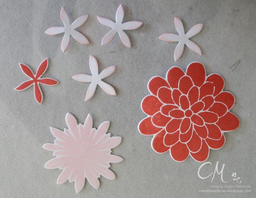 Zunächst habe ich einige Blüten gestempelt und ausgestanzt. Die größte Blüte habe ich in Melonensorbet gestempelt, außerdem eine etwas kleiner in Kirschblüte und schließlich noch eine kleine noch einmal in Melonensorbet. Die kleinste Blüte habe ich dann noch 4 mal aus flüsterweißem Farbkarton ausgestanzt und die Ränder mit einem Schwamm in Kirschblüte eingefärbt.